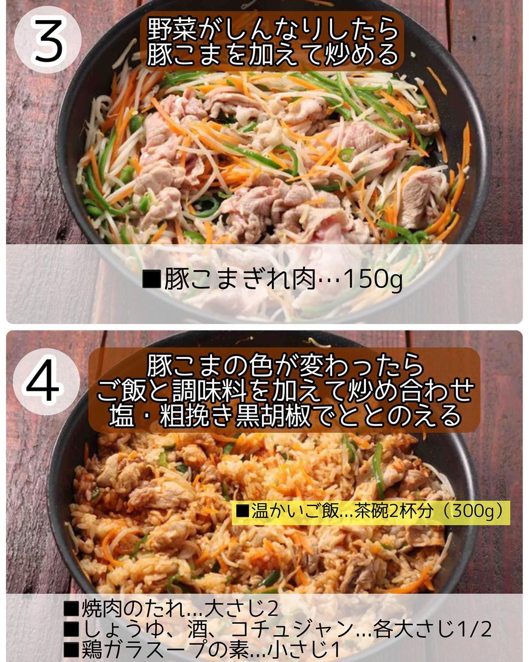 ➌豚肉の色が変わったら、温かいご飯・〔𝙰〕を加えて炒め合わせ、塩・粗挽き黒胡椒で味をととのえる。お好みで目玉焼きをトッピングする。