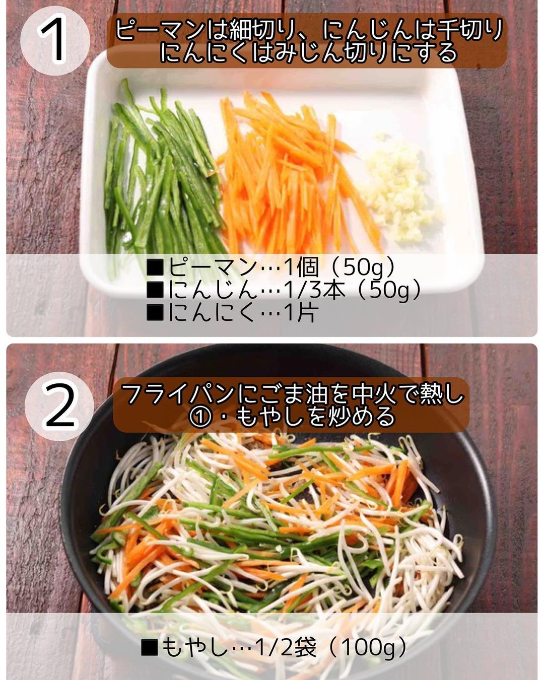 ➋フライパンにごま油を中火で熱し、1・もやしを加えて炒める。野菜がしんなりしたら、豚肉を加えてさらに炒める。