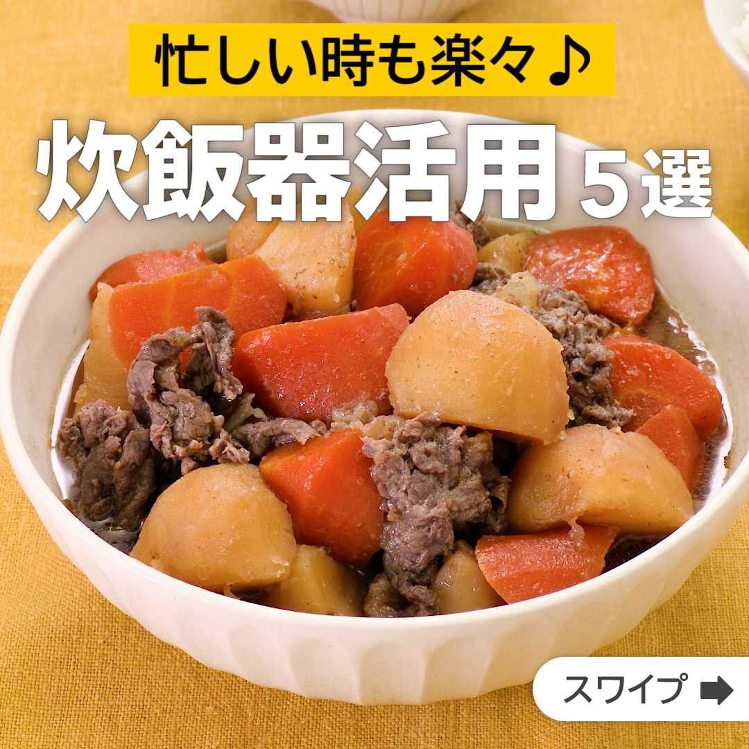 材料を全て入れてスイッチを押すだけ♪火加減を心配する必要もないので手軽に作れます!ほくほくの肉じゃがを炊飯器で作ってみませんか?※お使いの炊飯器によって機能が異なるため、取扱説明書をご確認のうえお作りください。