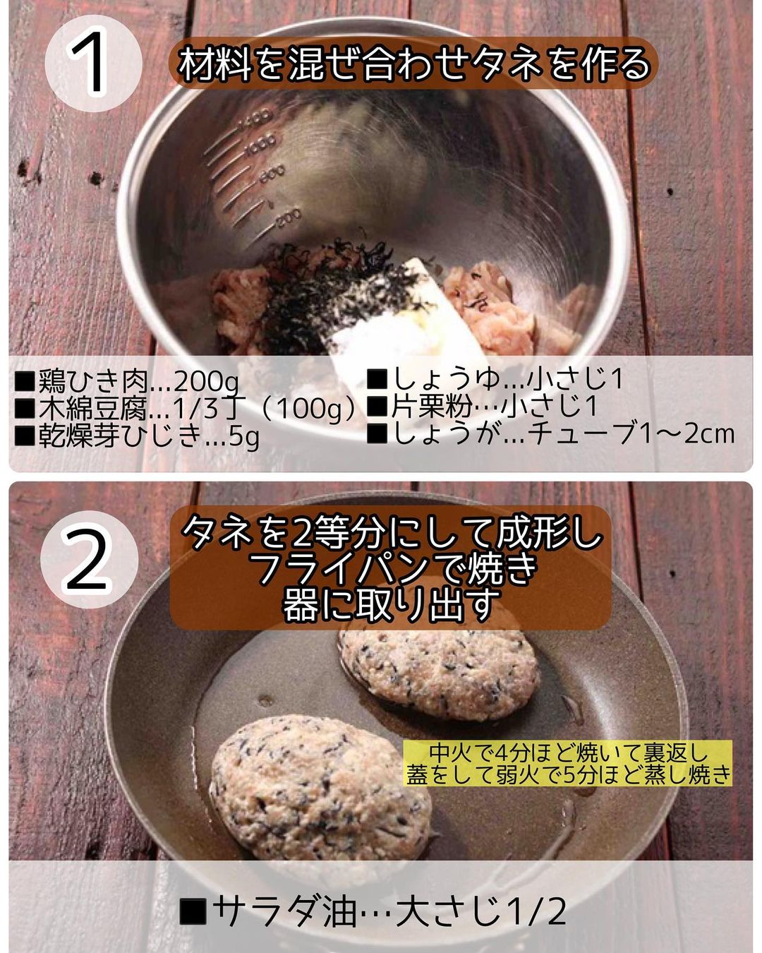 ➋フライパンにサラダ油を広げ、1を2等分にして成形して並べる。中火にかけ、𝟺分ほど焼いて裏返し、蓋をして弱火で𝟻分ほど蒸し焼きにする。全体に火が通ったら、取り出して器に盛る。