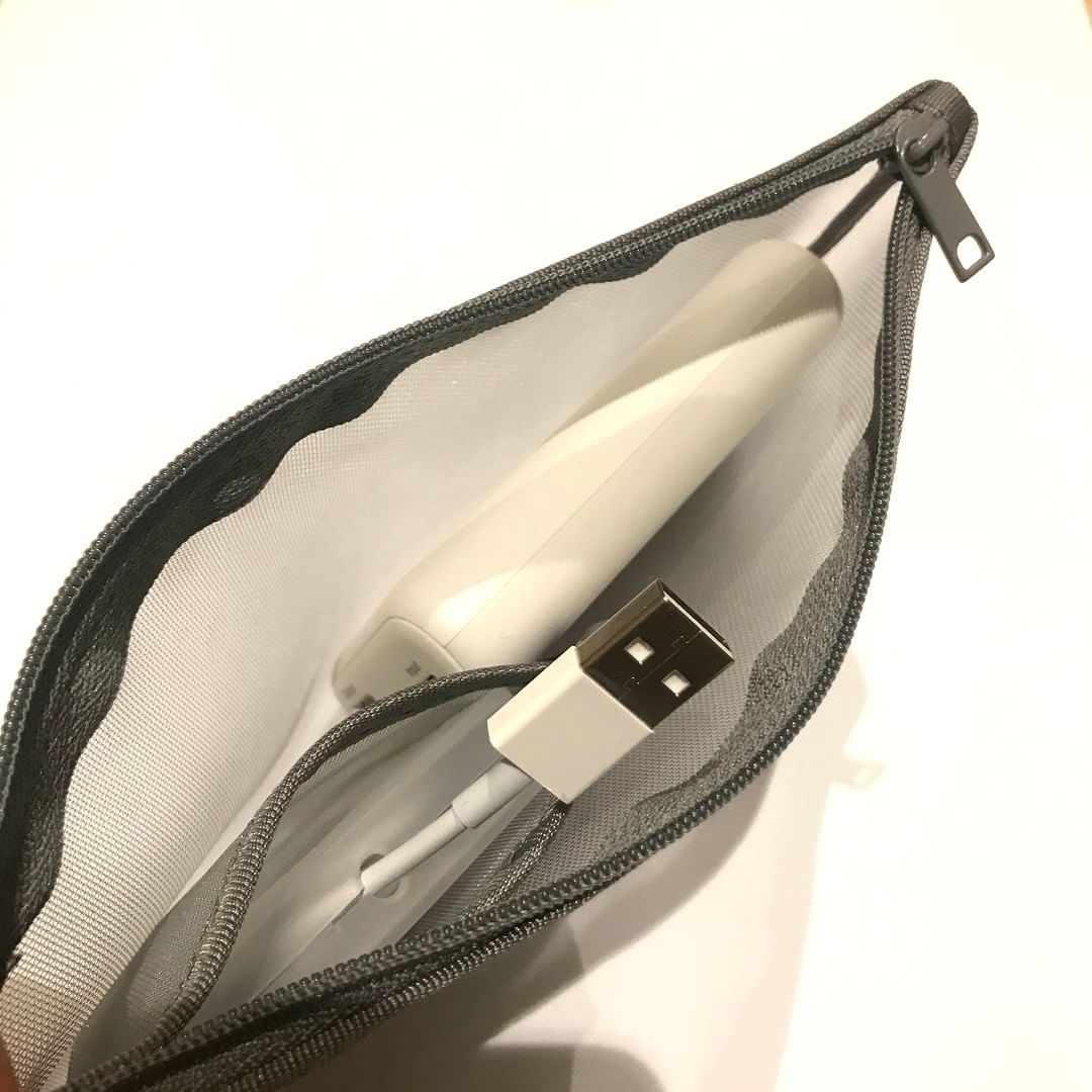 かさばりやすいケーブルは『ポリプロピレン ケーブル収納 角型』に収納して、ポケット部分に入れてあります。ポケットには、USBメモリーやイヤホンを入れてもいいですよね。