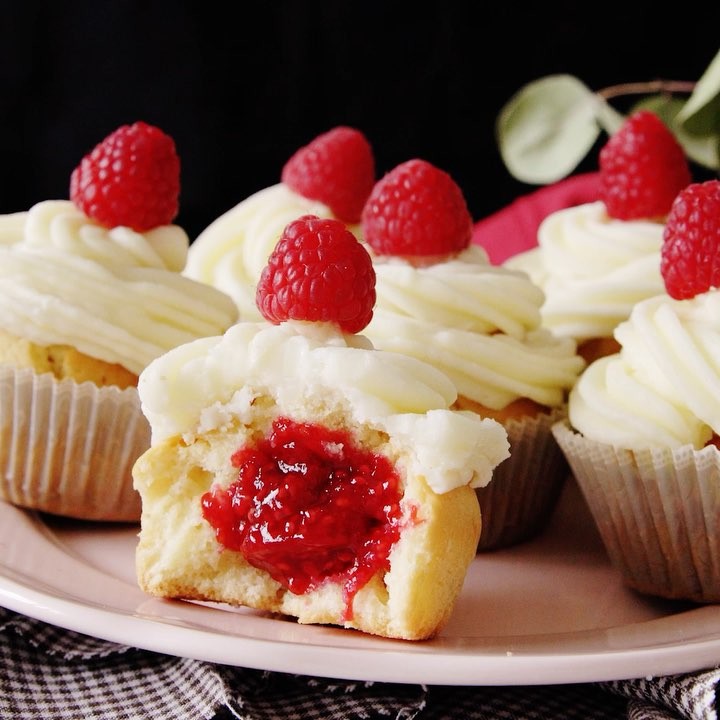 8. 焼きあがったカップケーキの粗熱が取れたら、中央をくり抜き、6のラズベリージャムを入れる。