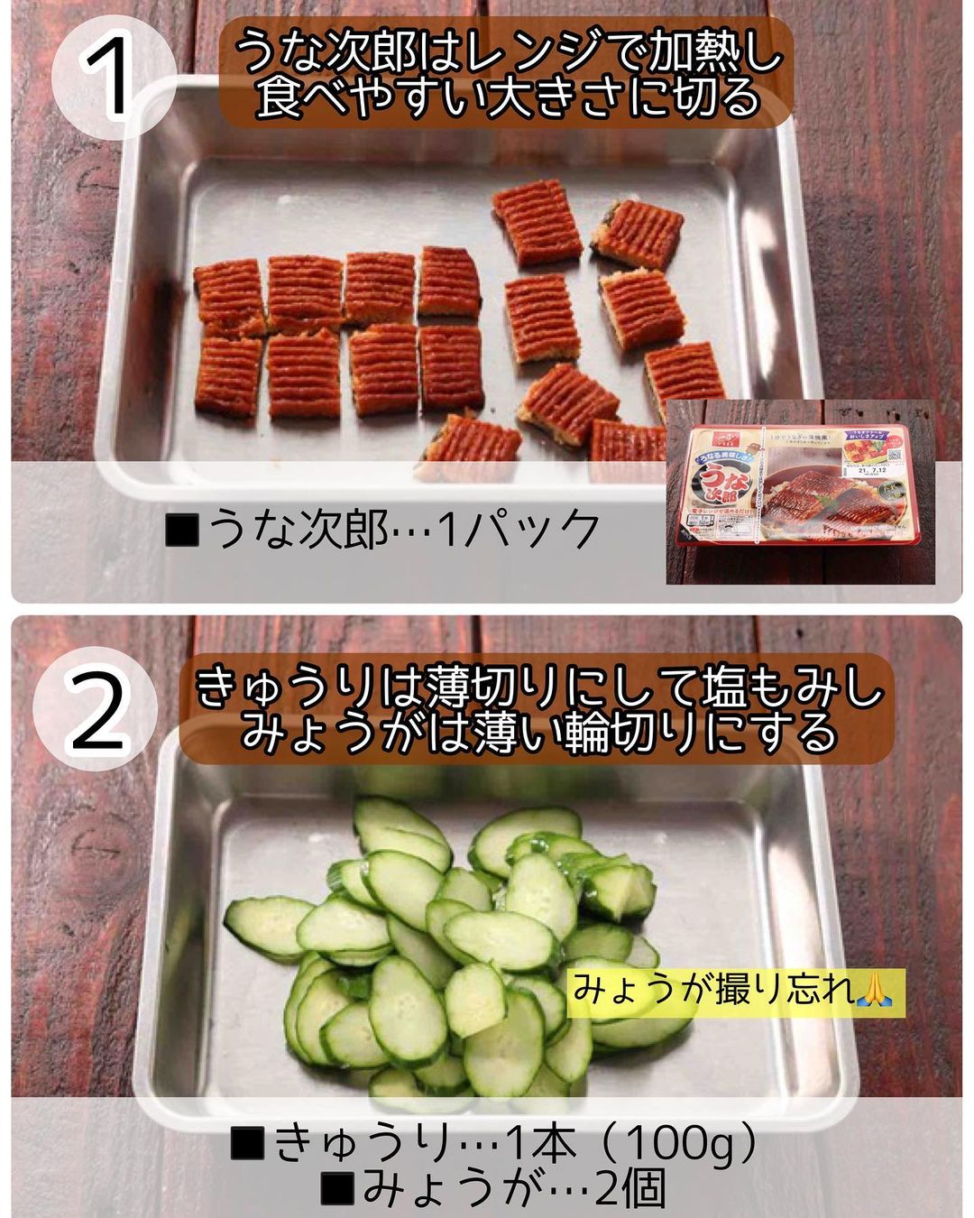 ➊うな次郎は、電子レンジ𝟼𝟶𝟶𝚠で𝟻𝟶秒加熱し、食べやすい大きさに切る。きゅうりは、斜め薄切りにして塩少々(分量外)で揉み、𝟻分おいて水気を絞る。みょうがは薄い輪切りにする。