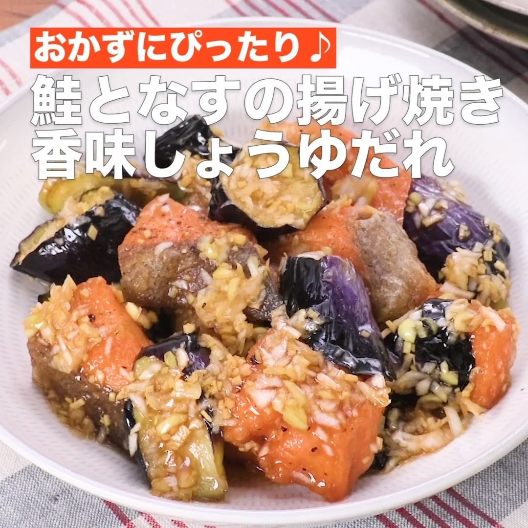 ⑤<おかずにぴったり♪鮭となすの揚げ焼き香味しょうゆだれ>