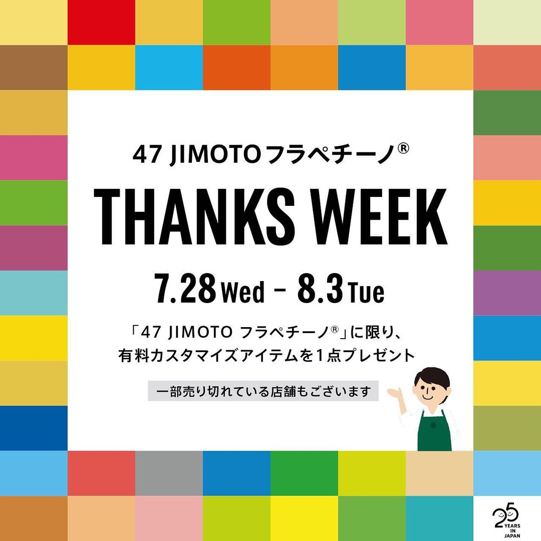 明日(7/28)から、全国の地元で楽しむお客様へ感謝の気持ちを込めて、『47 JIMOTO フラペチーノ® THANKS WEEK』がスタート✨