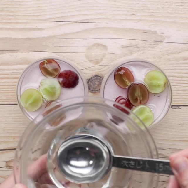 7.(3)の容器にカットしたぶどうの半量と(5)の半分の量を流し入れ、ラップをして冷蔵庫で1時間ほど冷やす。