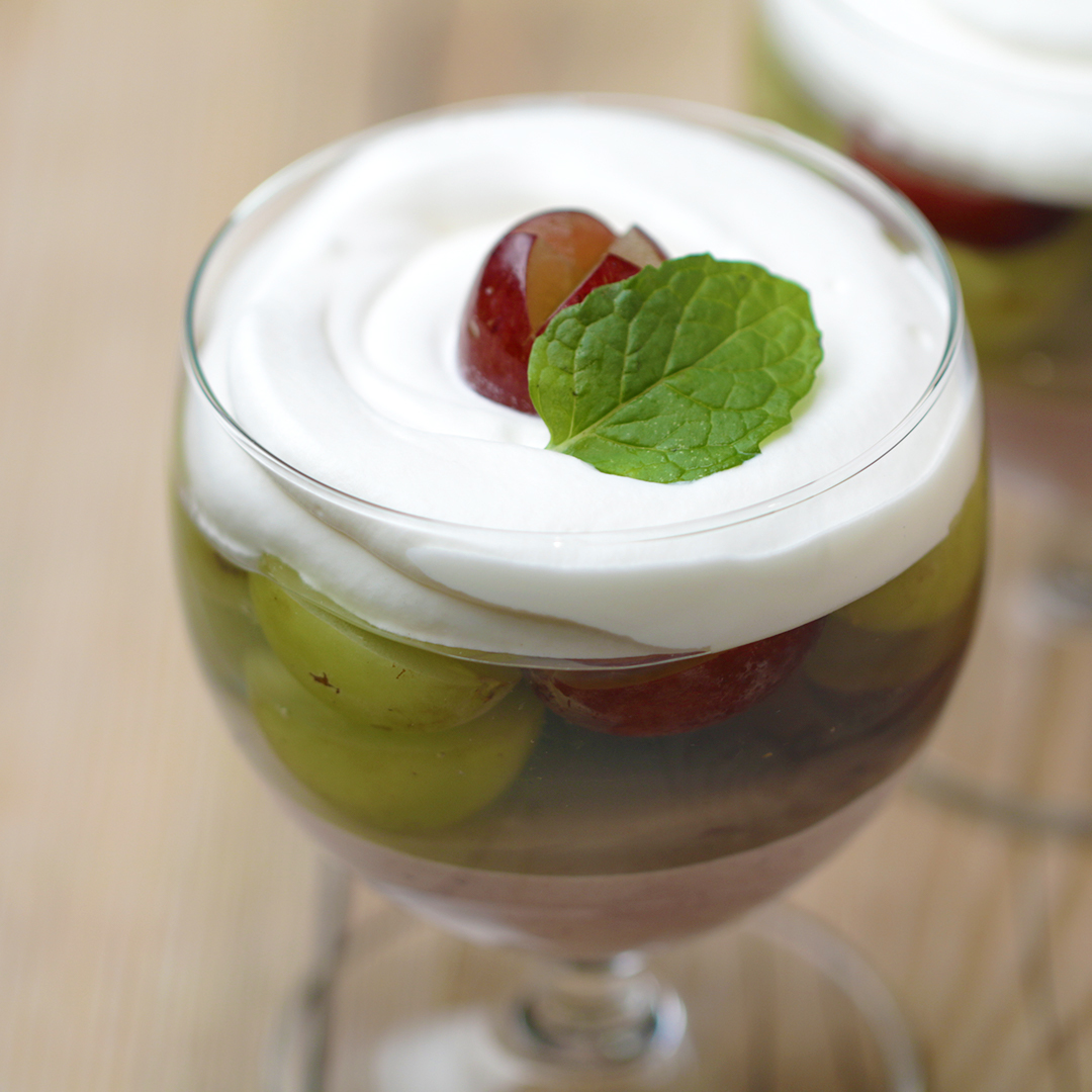 10.(8)の上に(9)のホイップクリーム、飾り切りしたぶどうとミントの葉を乗せたら、完成!