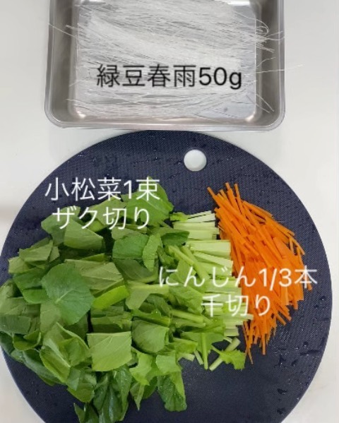 ➊小松菜は𝟹〜𝟺𝚌𝚖長さに切る。にんじんは千切りにする。
