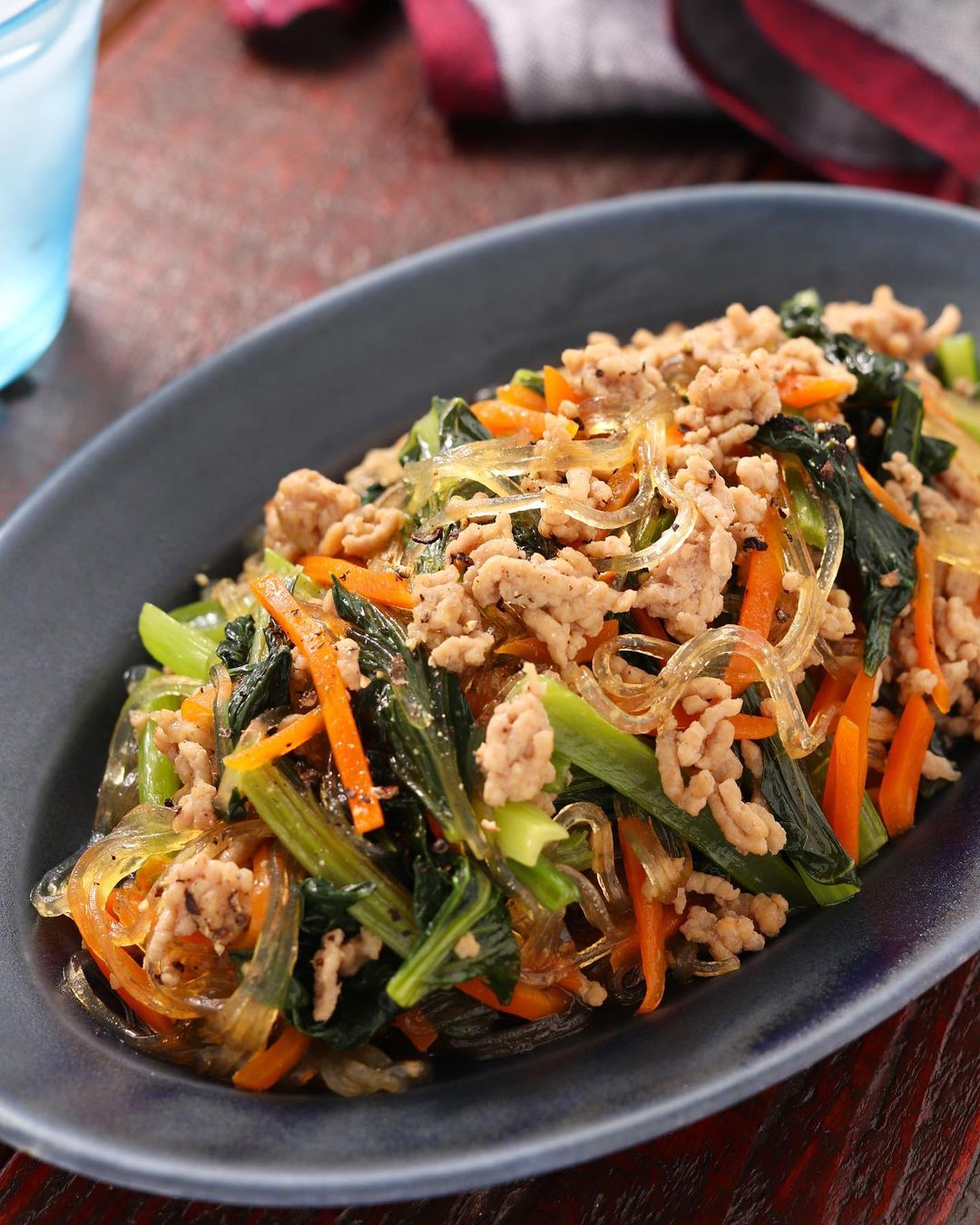 ➌野菜がしんなりしたら緑豆春雨・〔𝙰〕を加え、汁気がなくなるまで𝟸分ほど炒め煮する。仕上げに、お好みで粗挽き黒胡椒・ごま油をふる。