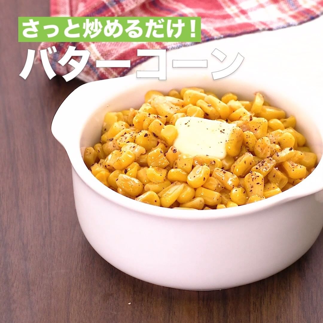 (1)フライパンにバター(10g)を入れて熱し、コーンを入れて2~3分中火で炒める。(コーン缶は缶汁を切る。)