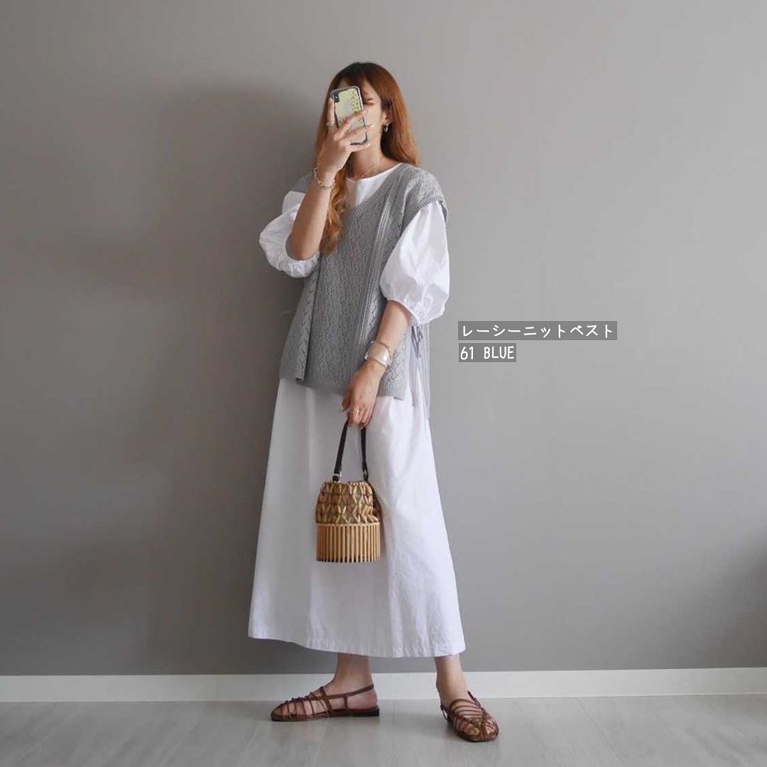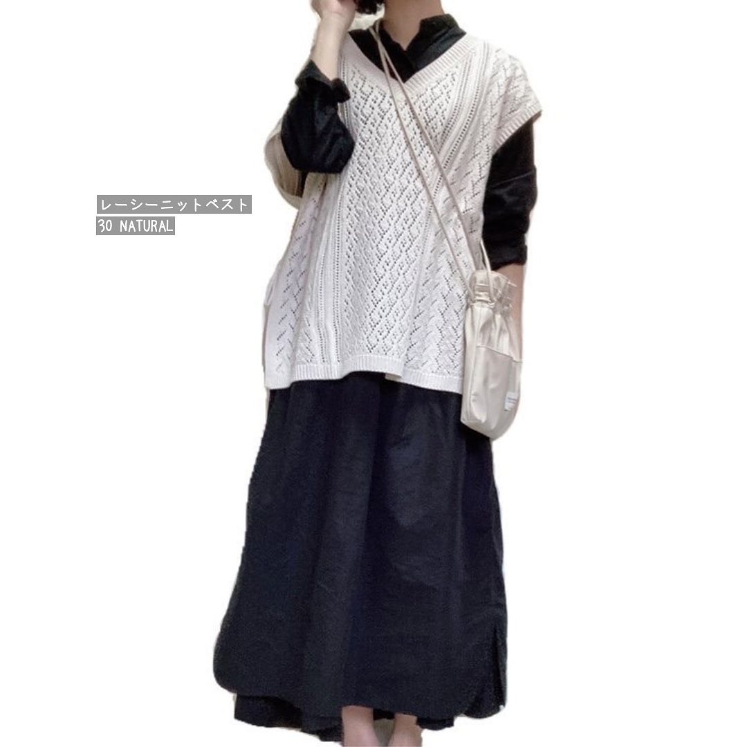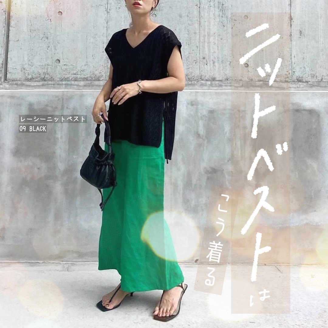 夏本番の✨ニットベストはこう着る🌻レーシーな透かし編みが繊細で、涼やか👏スリットデザインや、サイドのリボンが、オシャレ見え抜群のベストです👌暑い季節の、レイヤードスタイルを高めてくれるアイテムに、大注目です🙌