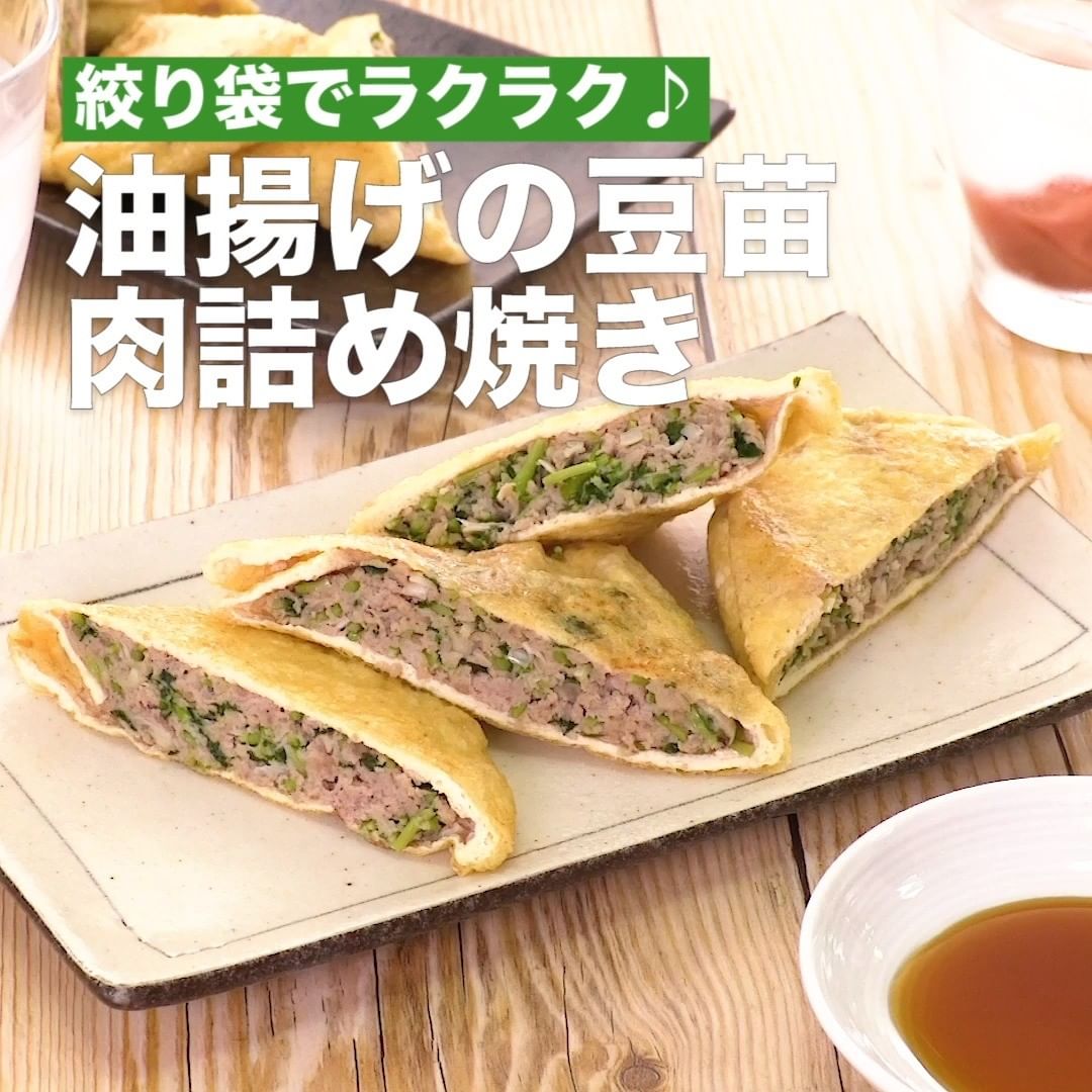 ⑤<絞り袋でラクラク♪油揚げの豆苗肉詰め焼き>