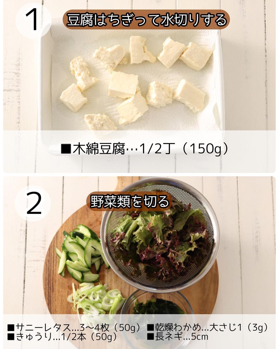 ➋サニーレタスは手でちぎり、きゅうりは縦半分に切ってから更に斜め薄切りにする。乾燥わかめはたっぷりの水に𝟻分ほど浸して戻す。長ネギは斜め薄切りにして水にさらす。