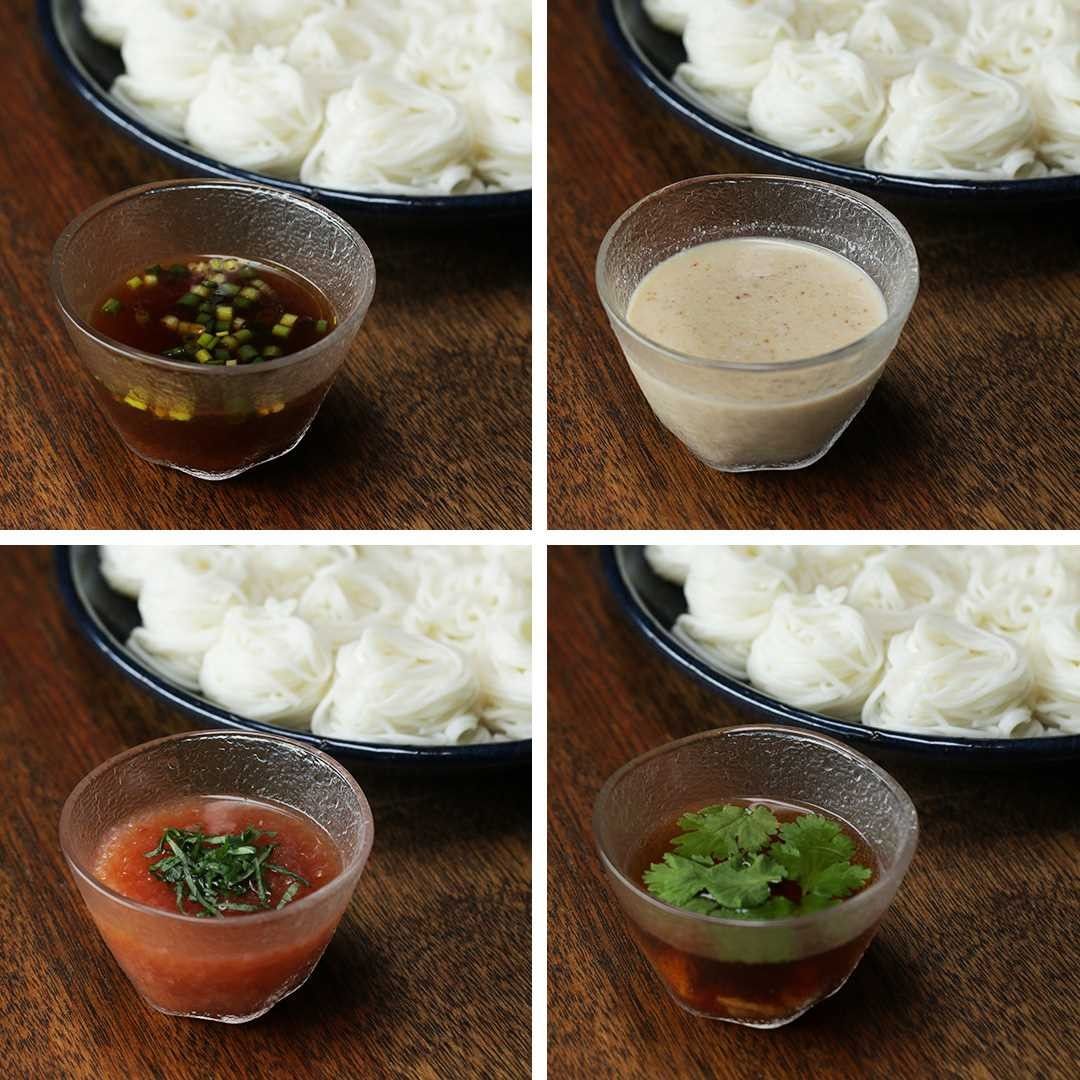 3.そうめんを器に盛り付け、別の器につけダレを注いで干しえび、パクチーをのせたら、完成!