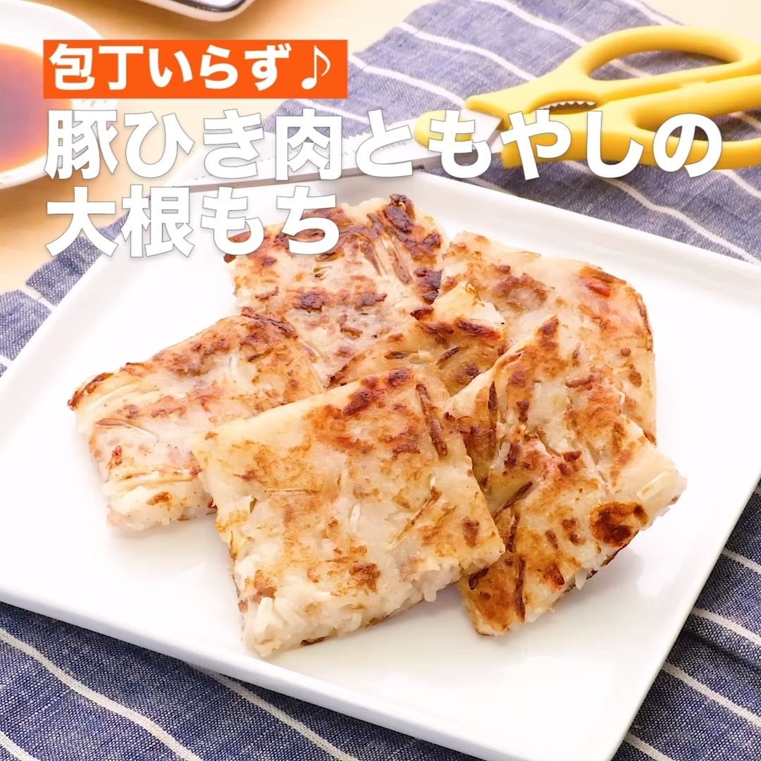 もちもち食感にもやしのシャキシャキ感がプラスされた大根もちレシピです♪表面はパリパリに焼いて香ばしさをプラスしましょう!