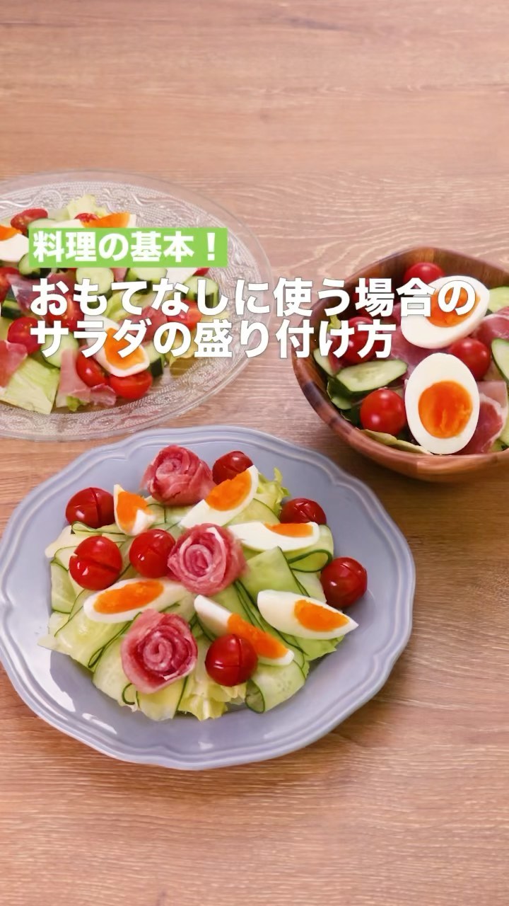 簡単なようで、おいしそうに盛るのが難しいサラダ。平たく広がってしまったり、マンネリしてしまったり。今回はおもてなしに使う場合の盛り付け方をご紹介します。生ハムをローストビーフやサラダチキンに変えたり、野菜をお好みのものに変えてみても♪緑・赤・黄・白の色を取り入れると彩り豊かに仕上がります。普段の食卓からおもてなしまで幅広く活用してみてはいかがでしょうか。