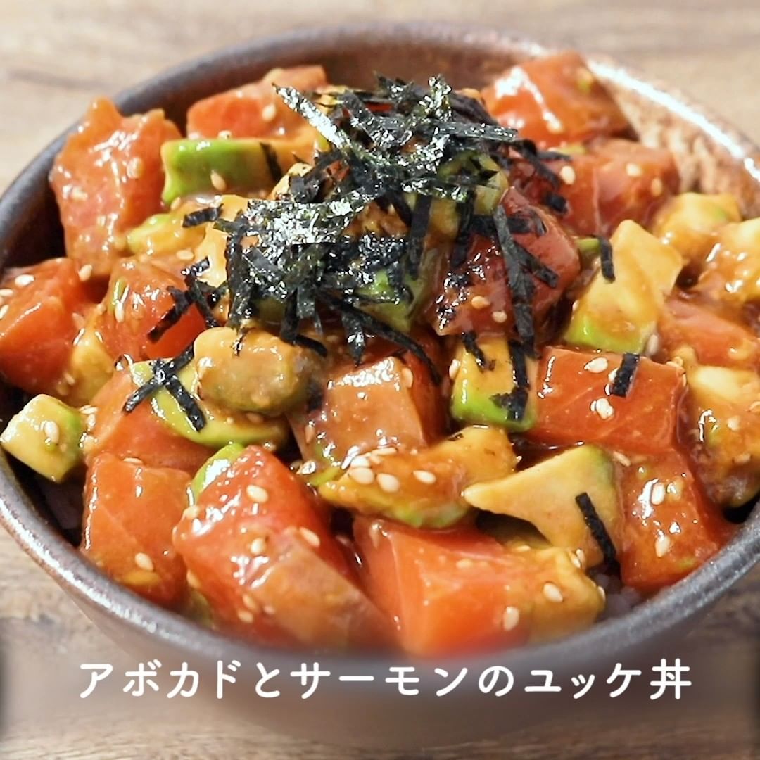 ①アボカドとサーモンのユッケ丼