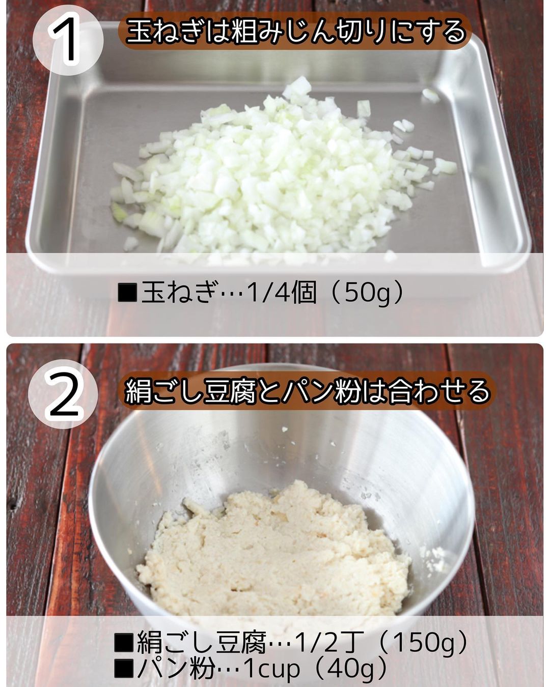 ➊玉ねぎは、粗みじん切りにする。絹ごし豆腐はパン粉と合わせ、水気をしっかり吸わせる。