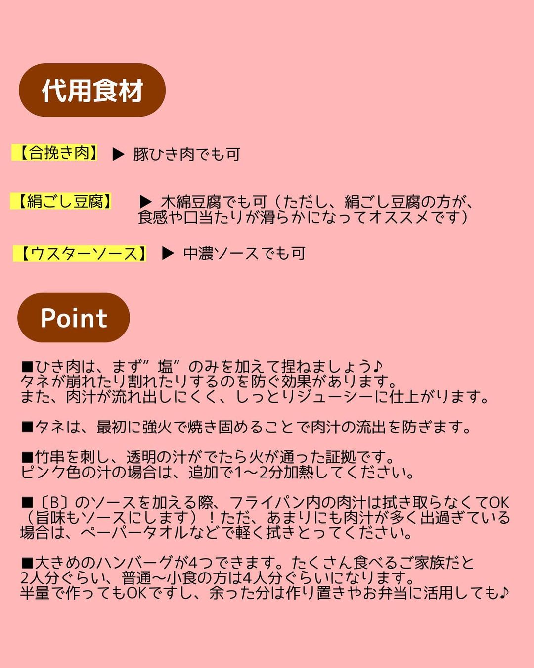 ➌フライパンにサラダ油を強火で熱し、2のタネを並べる。𝟷分ほど焼いて焼き色がついたら裏返し、蓋をして弱火で𝟼〜𝟽分ほど蒸し焼きにする。竹串などを刺し、透明の汁がでたら器に取り出す。(ピンク色の汁の場合は、追加で𝟷〜𝟸分蒸し焼きにしてください)