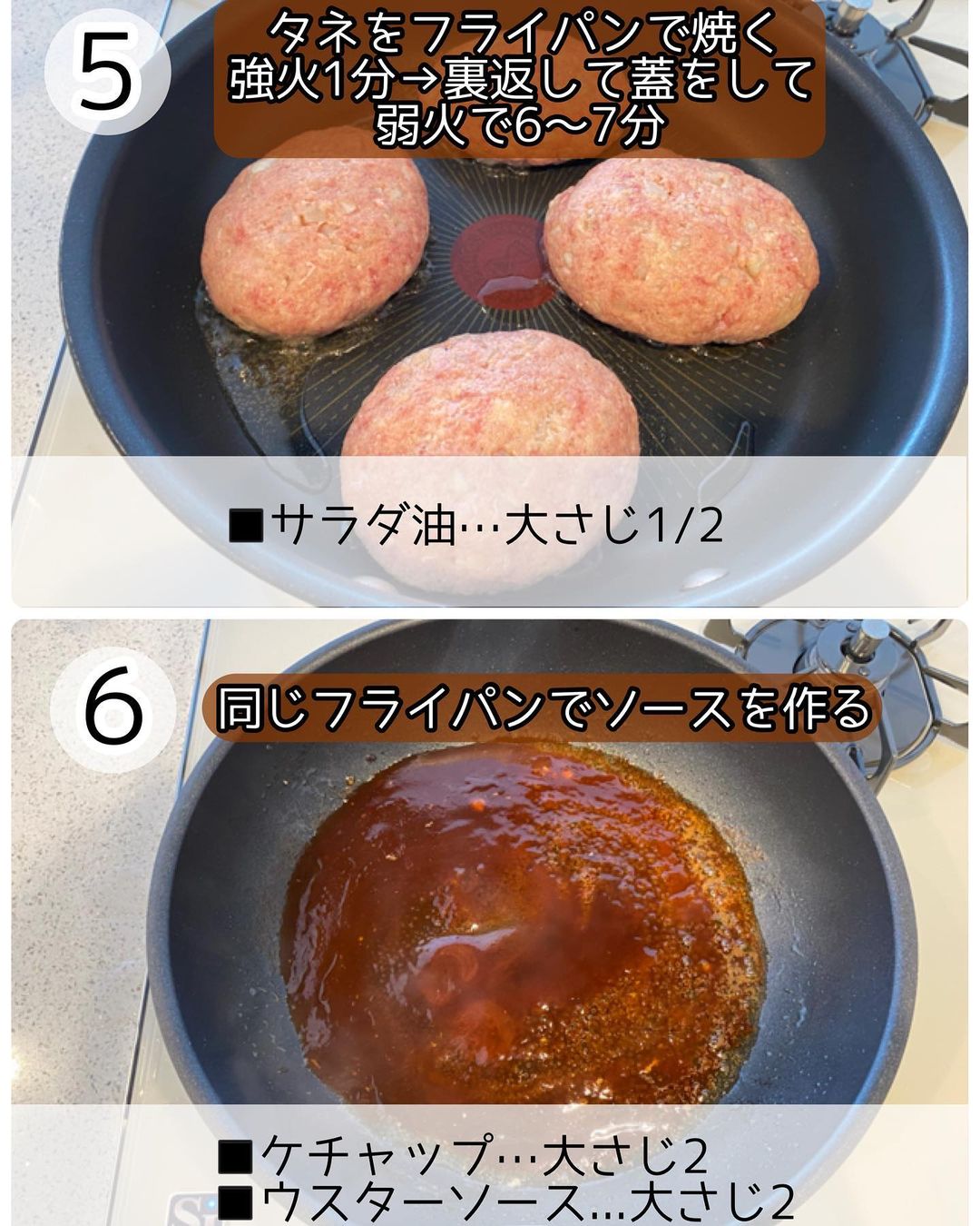 ➍同じフライパンに〔𝙱〕を入れ(肉汁はそのままで𝙾𝙺)、ふつふつしたら火を止め、3のハンバーグ にかける。