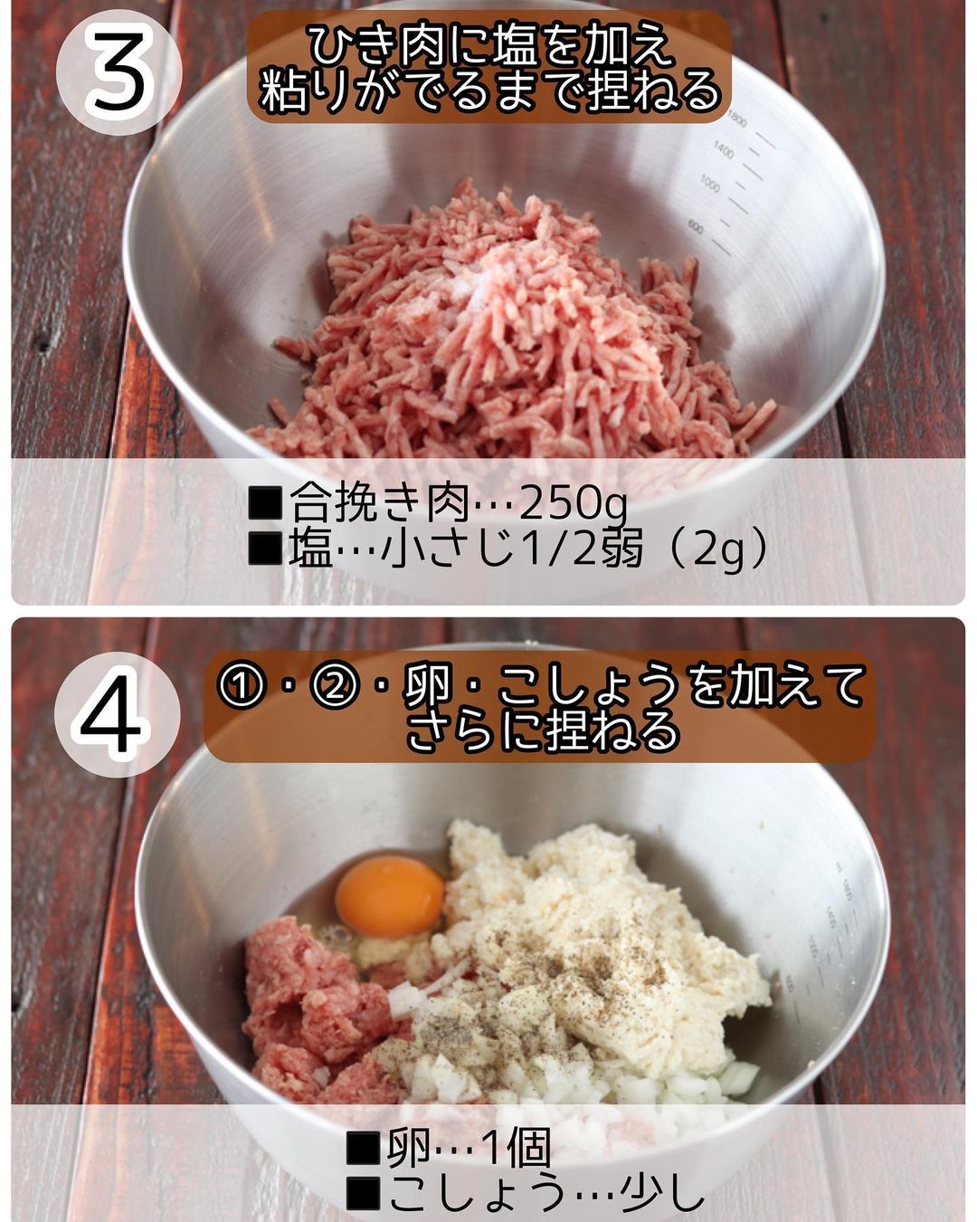 ➋ボウルに合挽き肉・塩を入れてよく捏ね、粘りがでたら、1・〔𝙰〕を入れてさらによく捏ね、𝟺等分にして俵型に成形する。