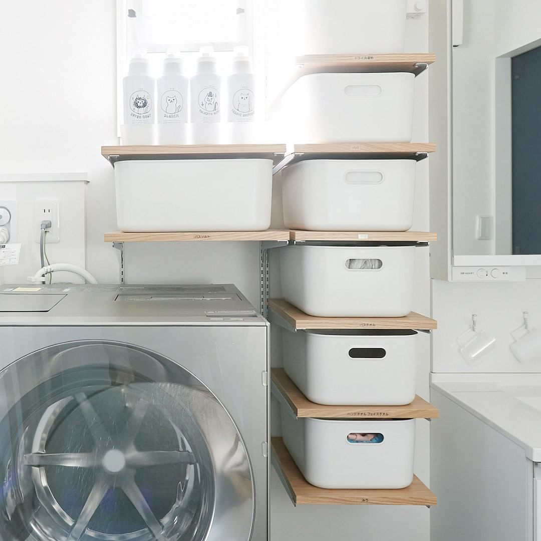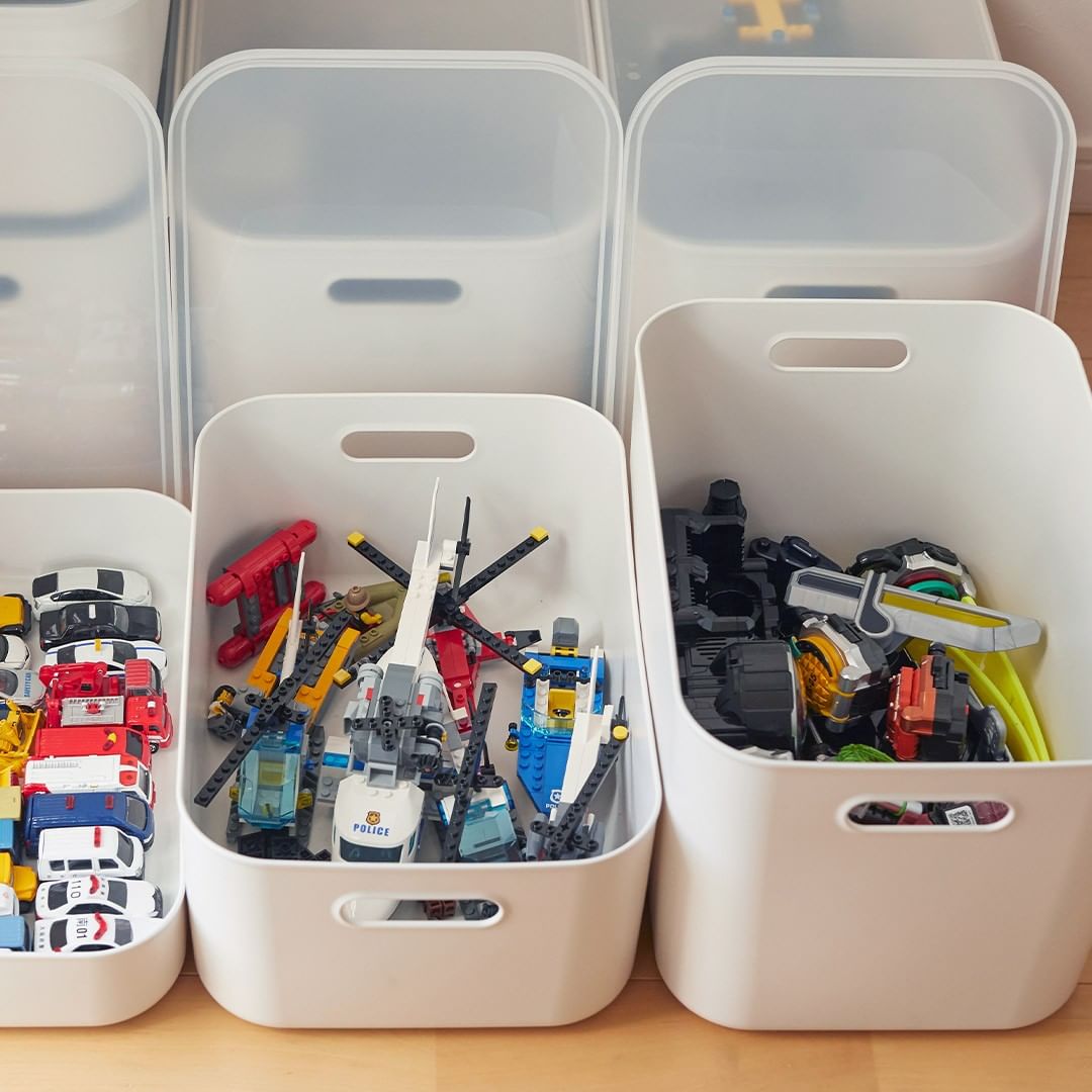 おもちゃの多いこども部屋や、さまざまな色やかたちの道具が並びがちな水まわりの収納に、白くて耐水性にすぐれた、ポリエチレンケースの収納を。