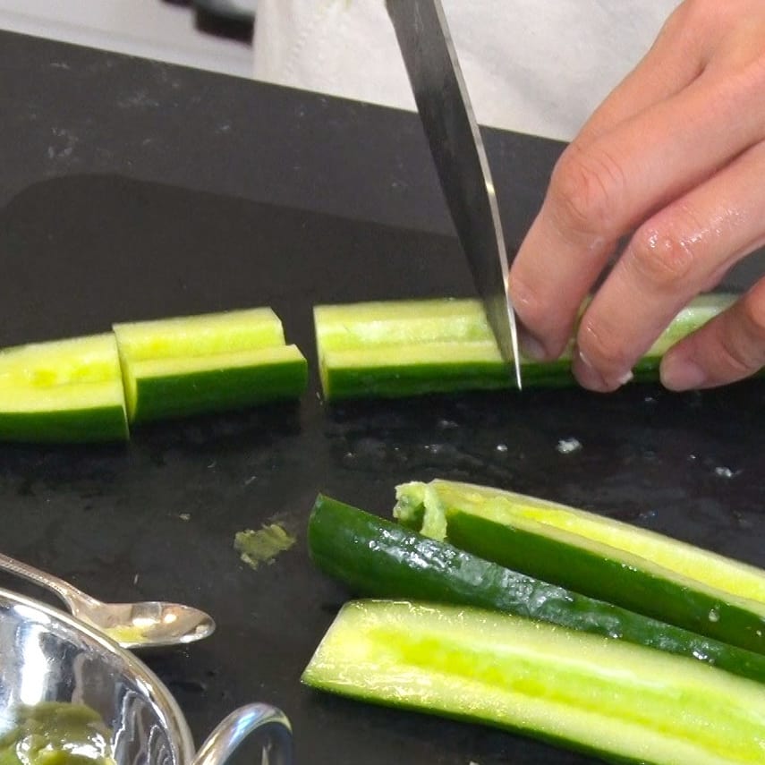 ⑦ ティースプーンを使いキュウリの種を取り、4cm幅に切る