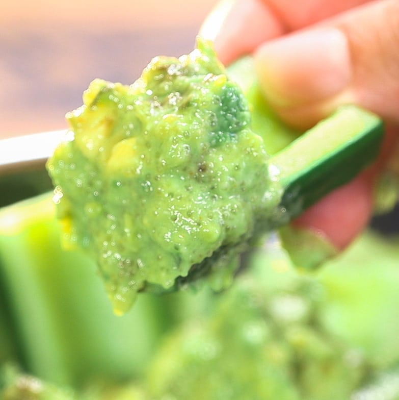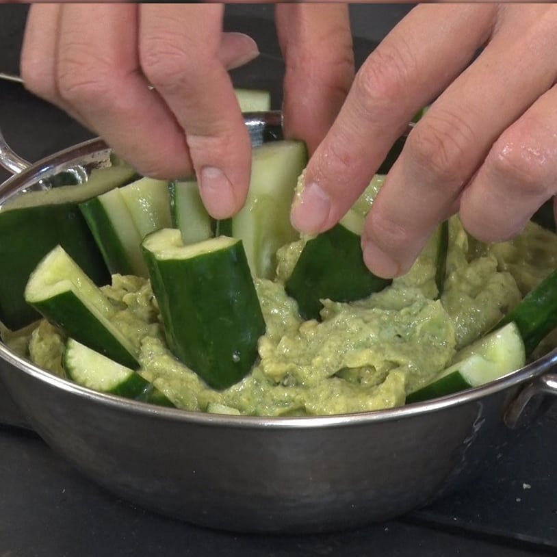 ⑧ アボカドディップに切ったキュウリを刺したら完成!