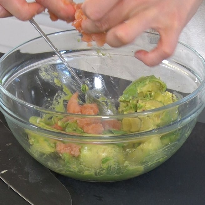 ① アボカド1個の種を取り、中身をくりぬいてボウルに入れる