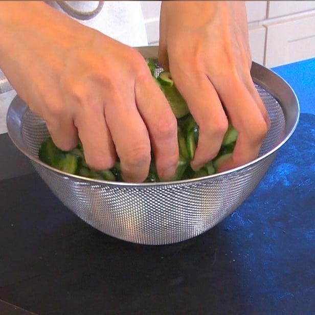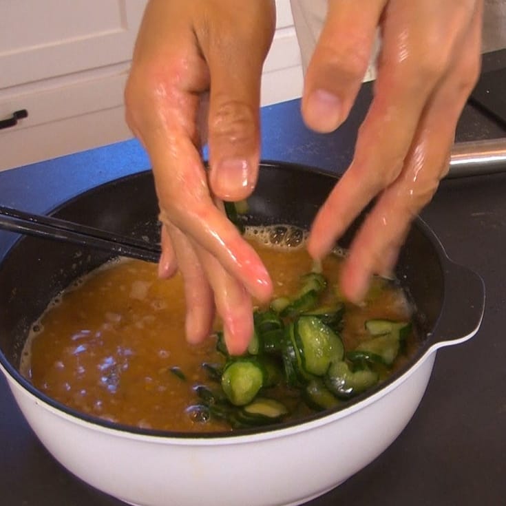 ④ 汁の粗熱がとれているか確認し、キュウリの水気をぎゅっと絞ってから加える