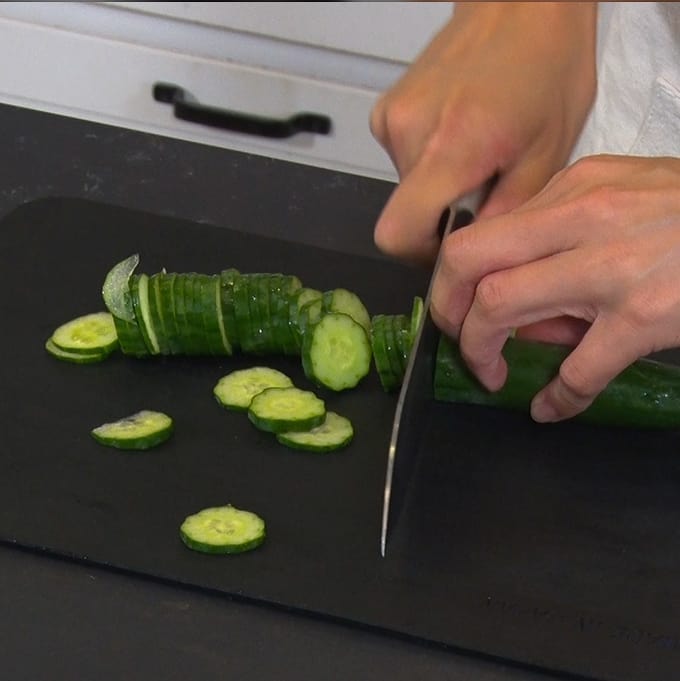 ③ キュウリ1.5本を小口切りにしザルに入れ、塩ひとつまみをふって塩もみし、そのまま5分ほどおく