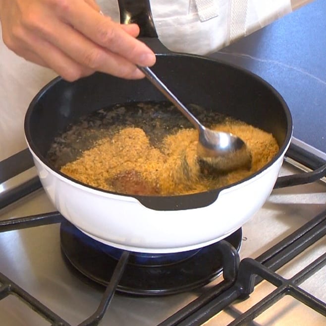 ① 鍋に水200ml、かつお節小分けパック1袋(4.5g)煮干しの粉大さじ3を入れて火にかける