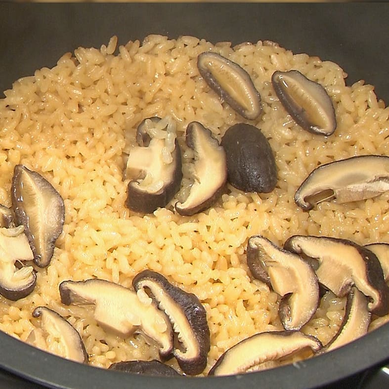 ② 研いだ米2合、しいたけの軸と薄切りしたかさを炊飯器に入れ2合分の水を注ぐ