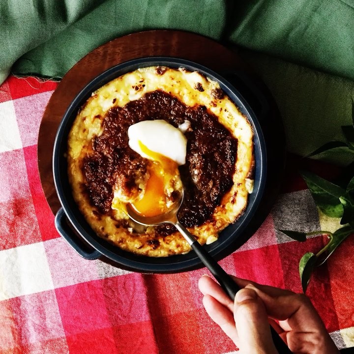 4. 耐熱容器にターメリックライスを広げ、ホワイトソースをかけて、塩・胡椒を振る。チーズをお皿に沿って散らし、中央にミートソースを流し入れる。250度のオーブンまたはトースターに入れて、表面に焼き色がついたら取り出して、半熟卵をのせる。