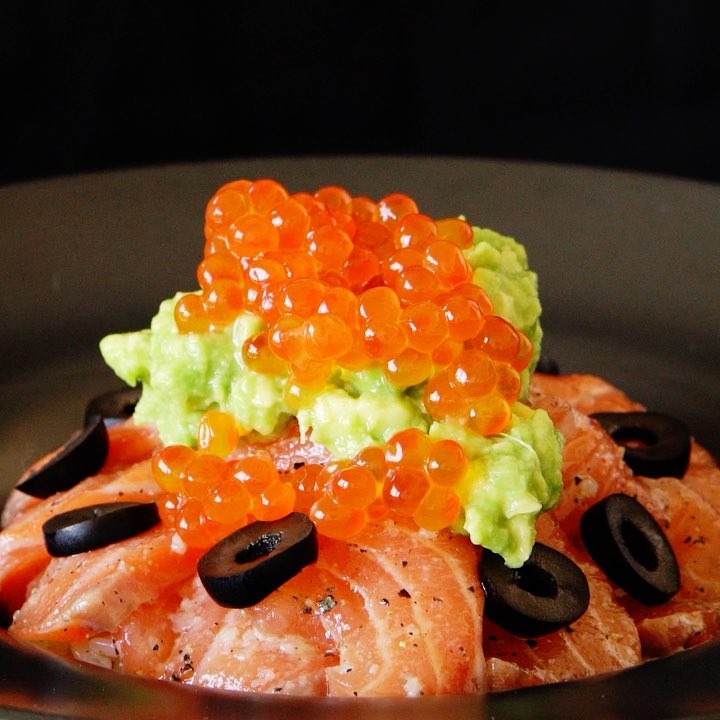 3.刺身用サーモンはうす切りして塩とブラックペッパーとオリーブオイル、すりおろしにんにくで味を付けマリネにしておく