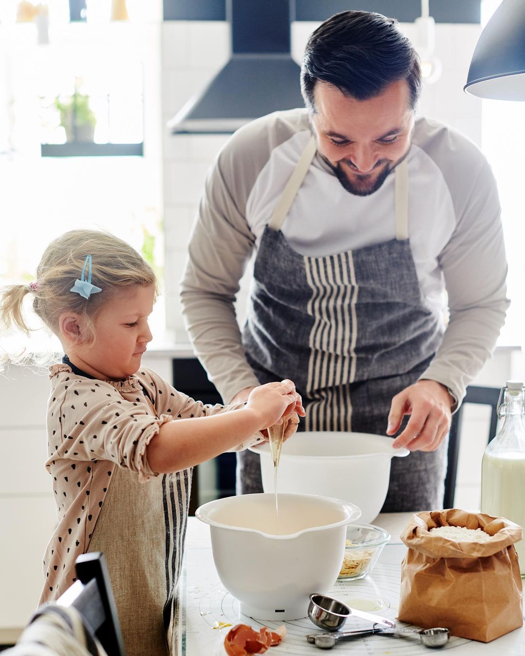 計量したり、混ぜたり、テーブルセッティングをしたり。キッチンで一緒に作業することで、子どもが料理の楽しさを学べるだけでなく、健康的な食習慣を身に付けるチャンスにもつながります。