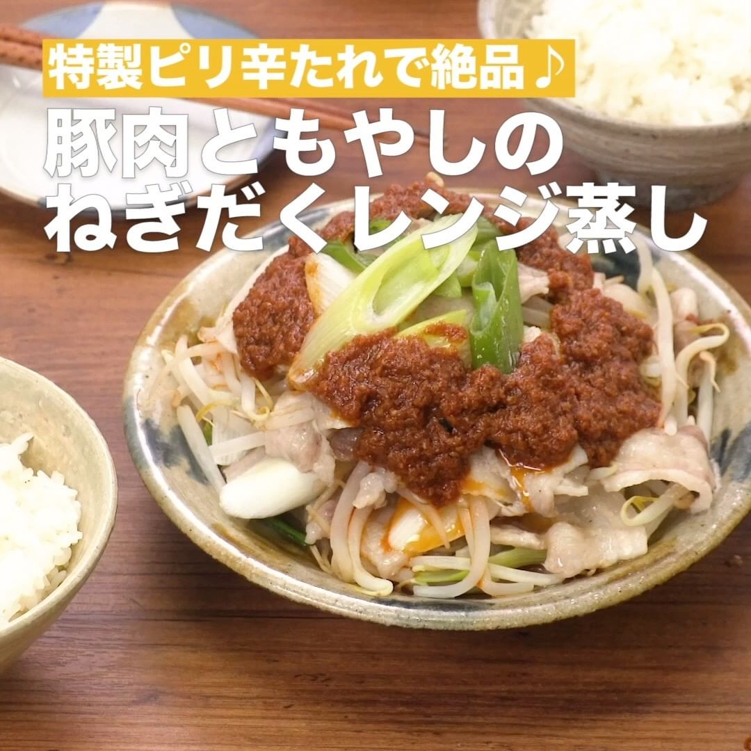 ⑤<特製ピリ辛たれで絶品♪豚肉ともやしのねぎだくレンジ蒸し>