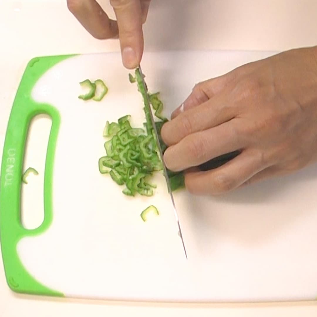 ⑤オクラ3本のヘタを切り落とし、縦半分に切りタネを取り、細かく薄切りする