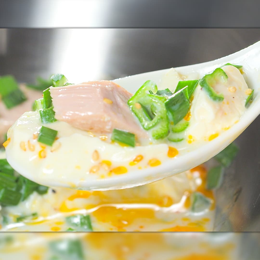⑧冷やした豆腐をスプーンなどですくいながら器に盛り、その上に粗くほぐしたツナをのせ、オクラの餡をかける