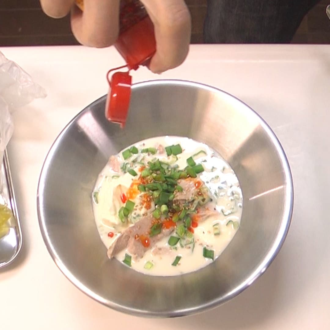 ⑨ハサミで切ったニラ、いりごま、ラー油をお好みの量かけたら完成!