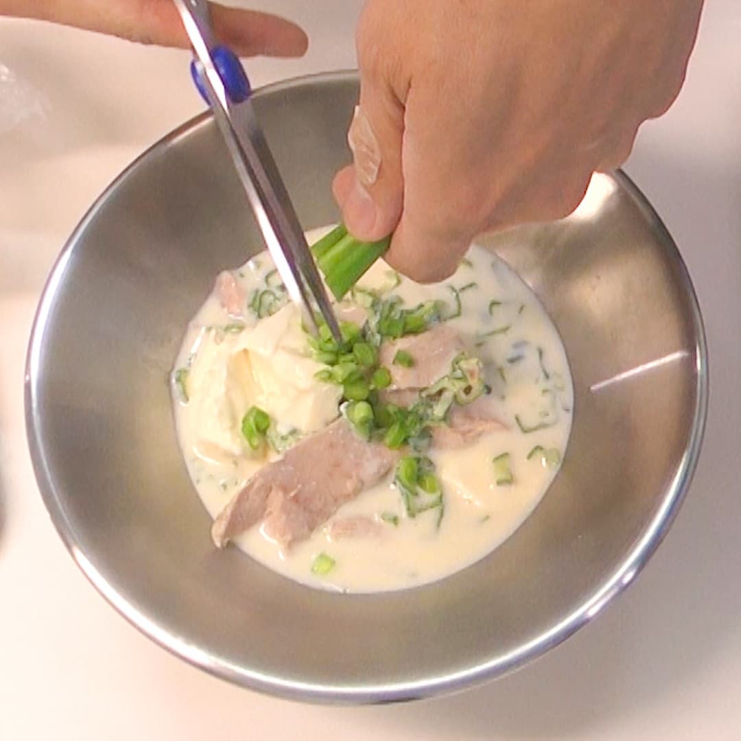 ⑥ボウルに薄切りしたオクラ、白だし大さじ3、豆乳80mlを入れてよく混ぜ、冷蔵庫で冷やす