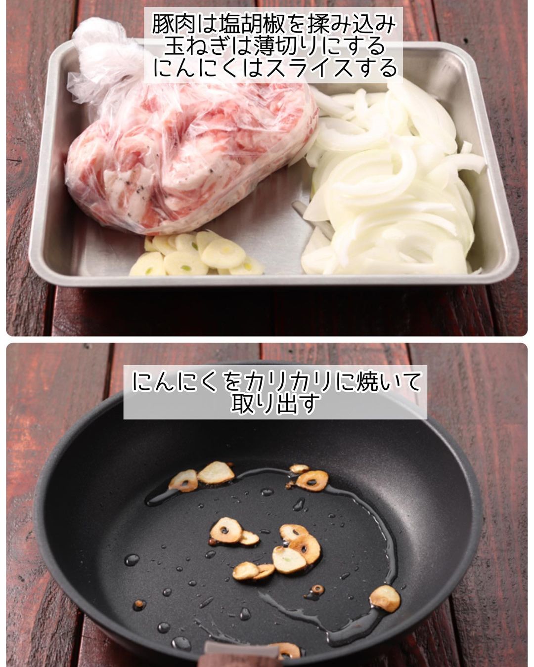 ➊豚肉は塩・こしょうを揉み込む。玉ねぎは薄切りにし、にんにくはスライスする。