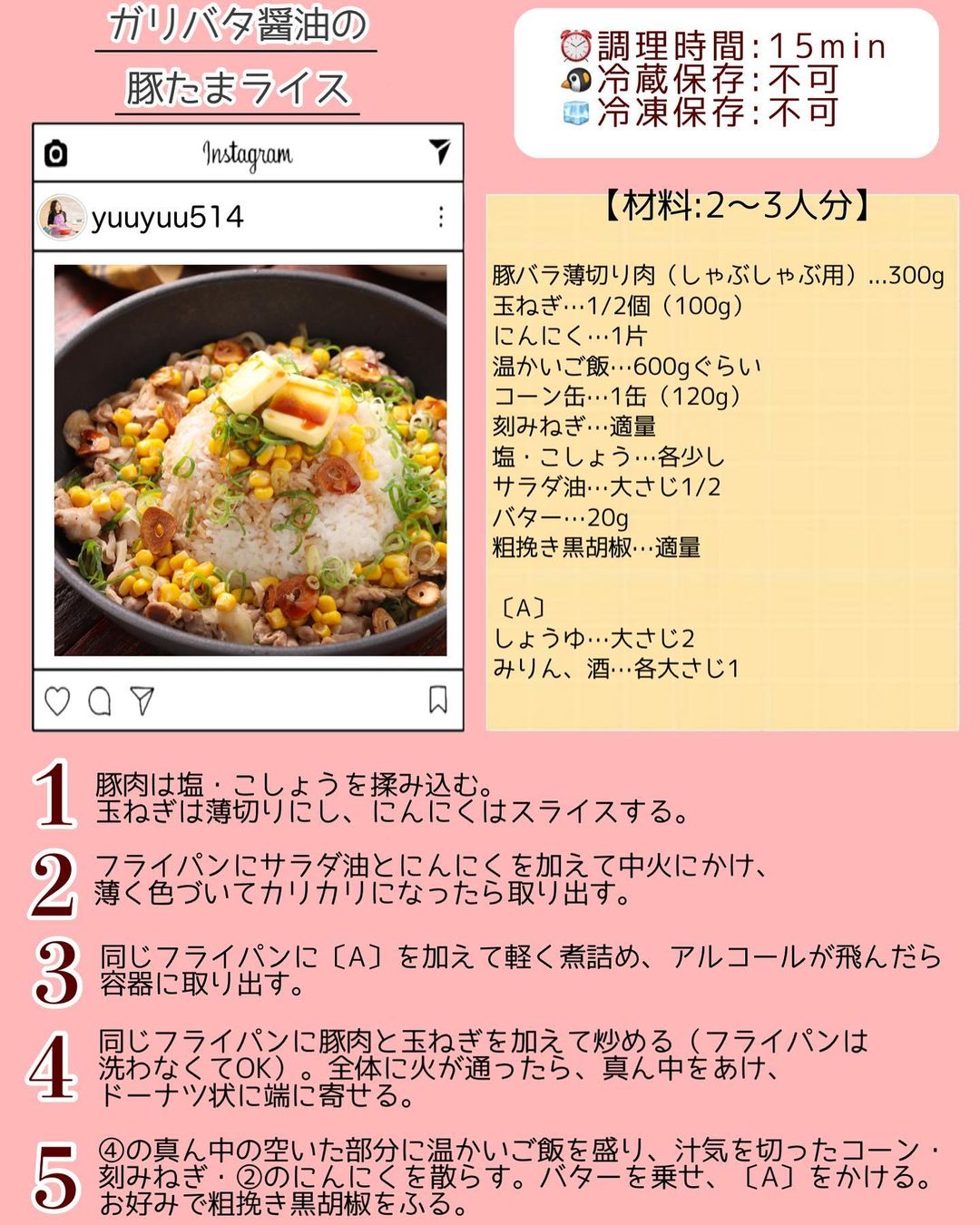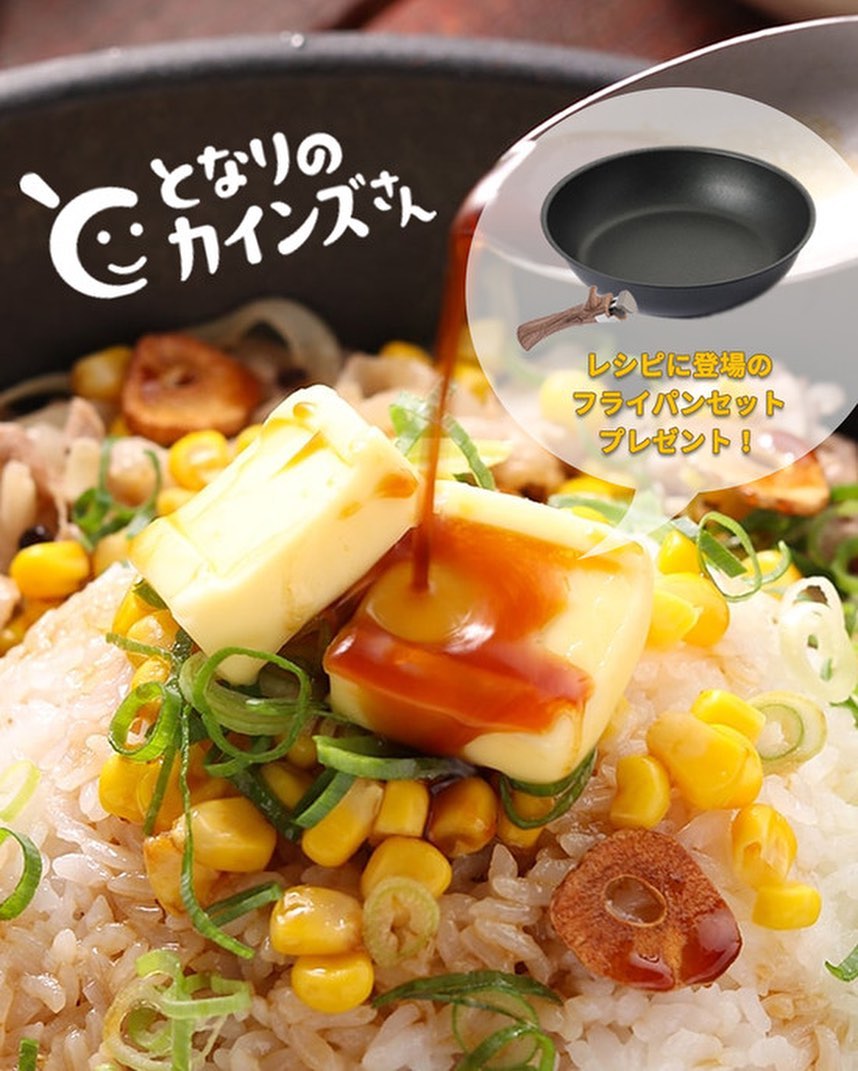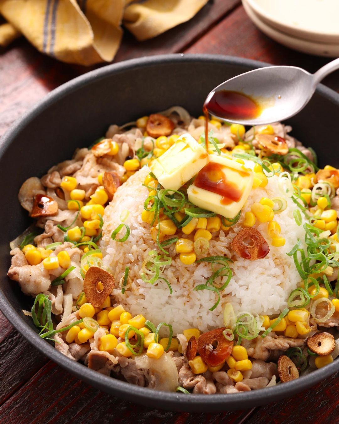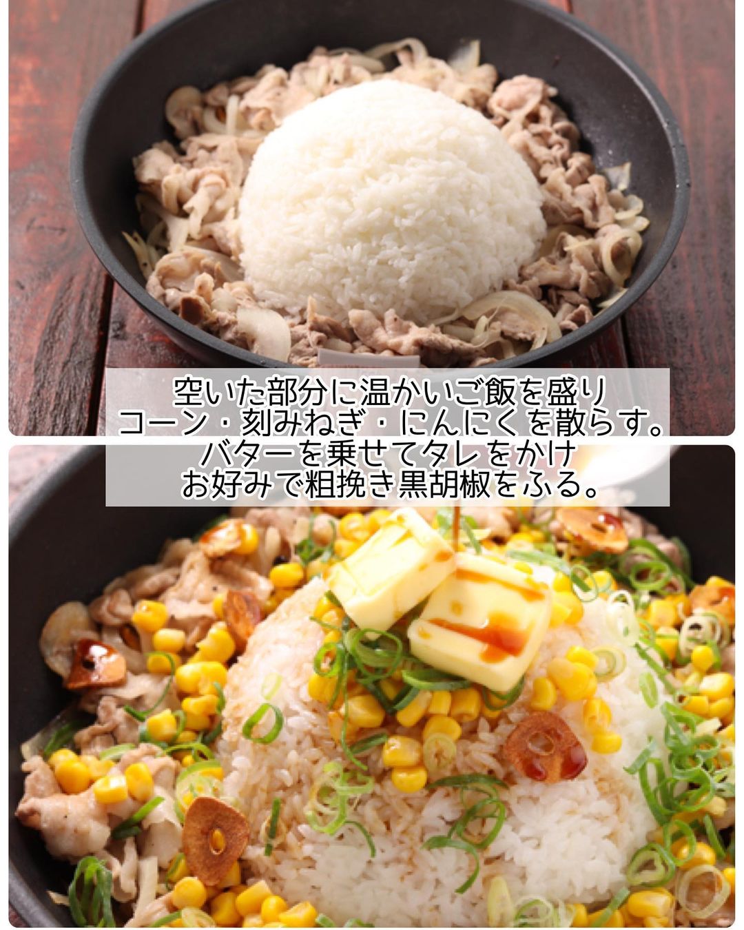 ➎𝟺の真ん中の空いた部分に温かいご飯を盛り、汁気を切ったコーン・刻みねぎ・𝟸のにんにくを散らす。バターを乗せ、〔𝙰〕をかける。お好みで粗挽き黒胡椒をふる。
