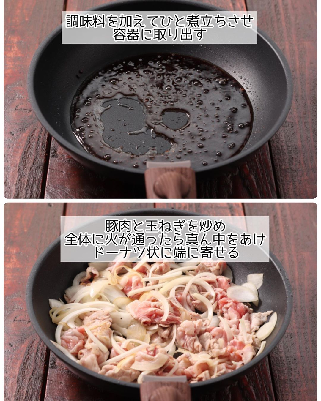 ➍同じフライパンに豚肉と玉ねぎを加えて炒める(フライパンは洗わなくて𝙾𝙺)。全体に火が通ったら、真ん中をあけ、ドーナツ状に端に寄せる。