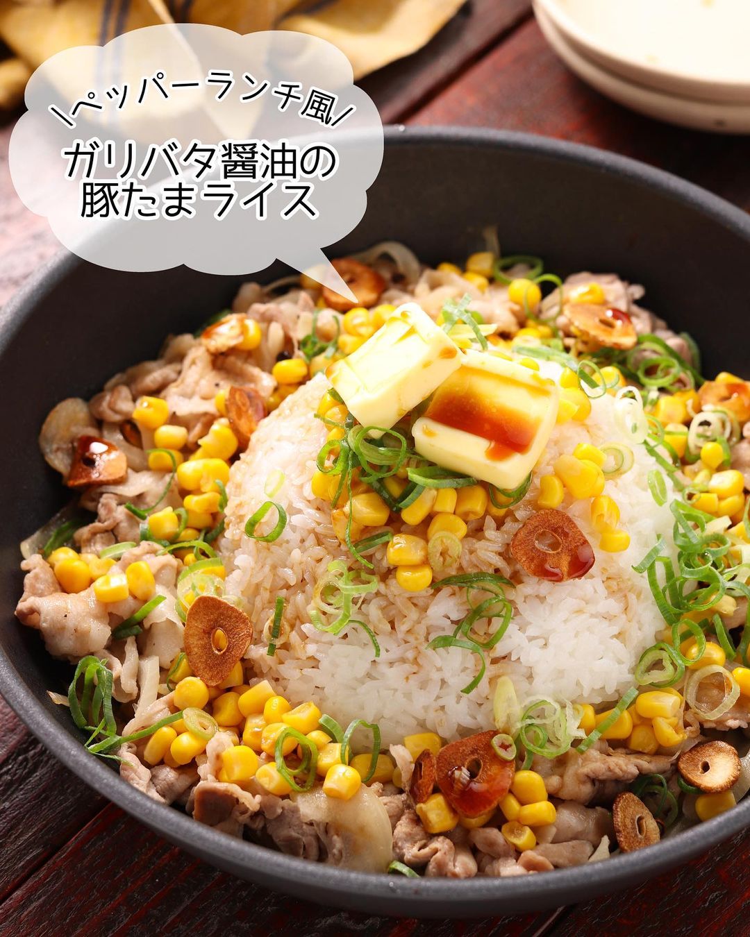 𓎩 ペッパーランチ風♪ #ガリバタ醤油の豚たまライス