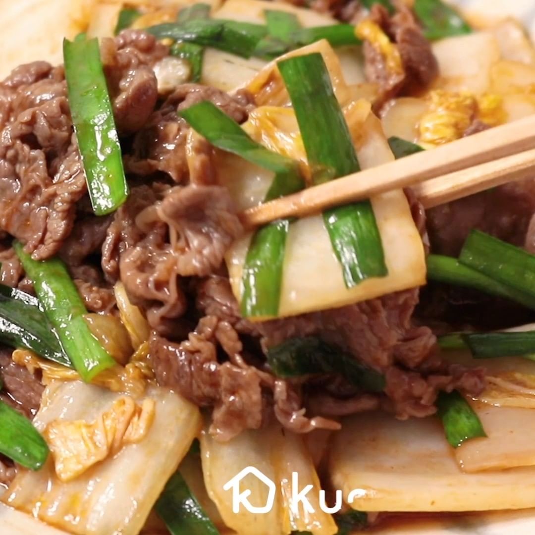 ②白菜でカサ増し 牛肉のピリ辛炒め