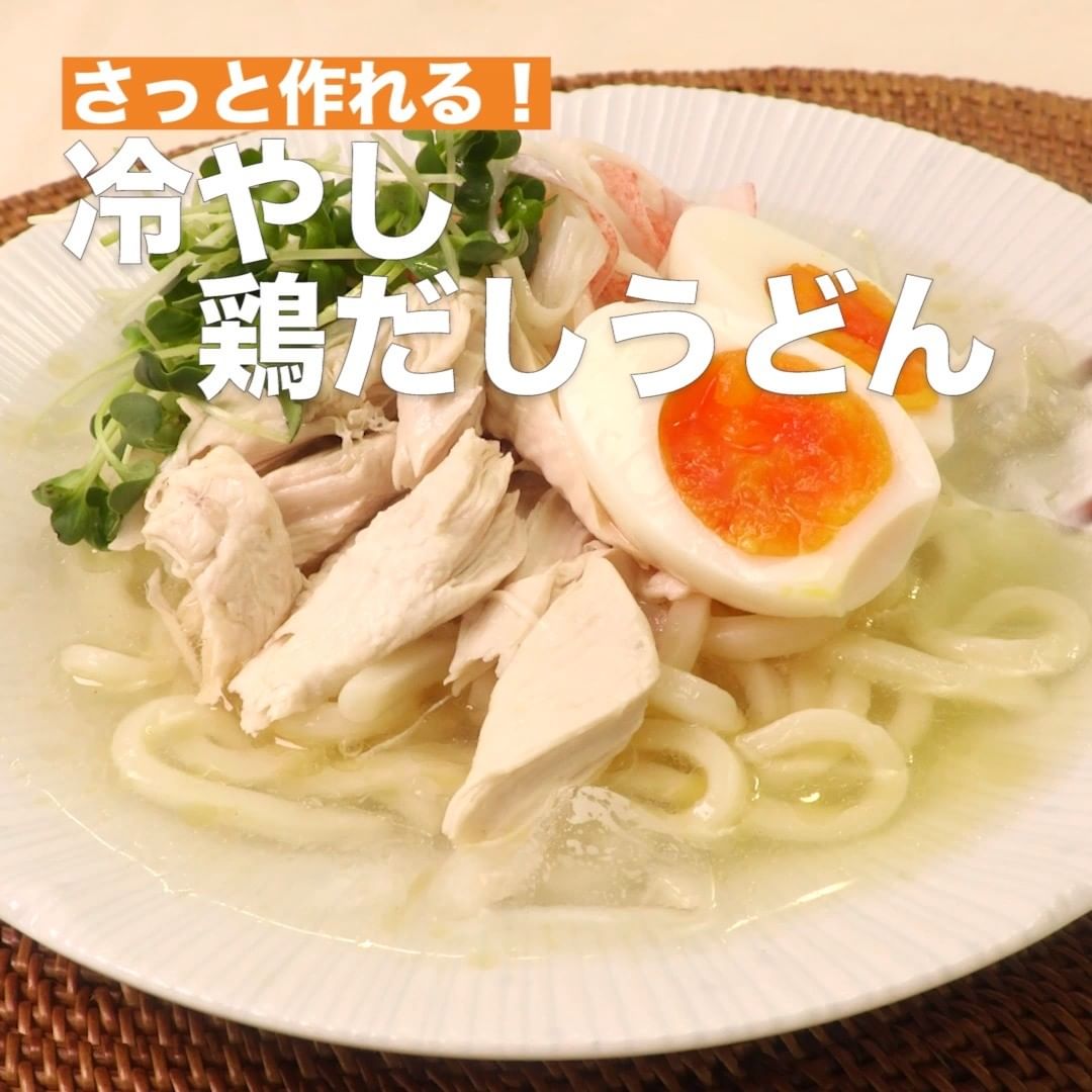 (5)器にうどんを盛り、ささみ、ゆで卵、かいわれ、かにかまをのせて鶏だしをかけて完成。