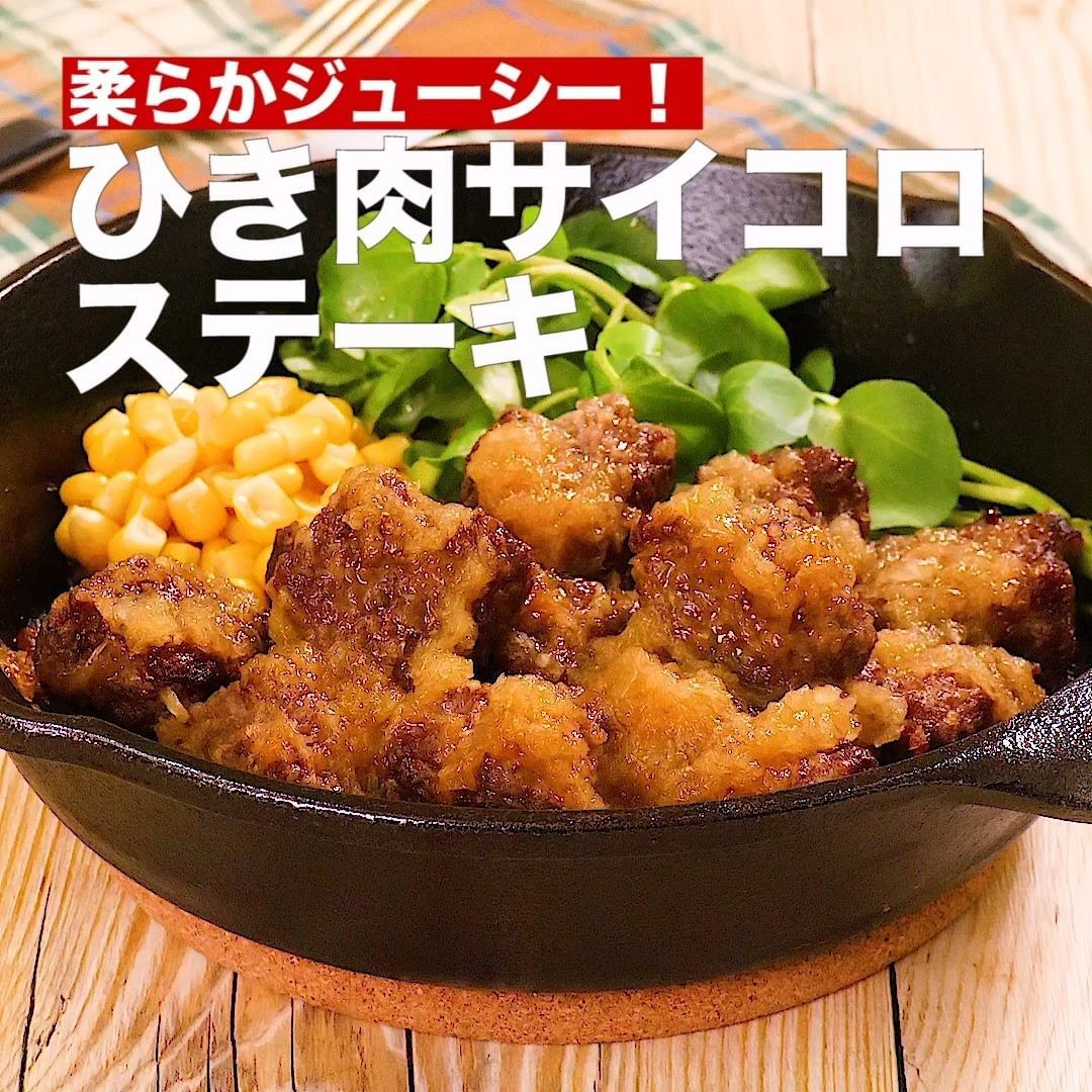 ひき肉で作る!サイコロステーキをご紹介です。見た目はサイコロステーキそのもの!ひき肉を使うことで、硬くならずやわらかい食感に仕上がります。玉ねぎの甘味と旨味がおいしい甘辛ステーキだれで、ごはんのおかわり必至です♪