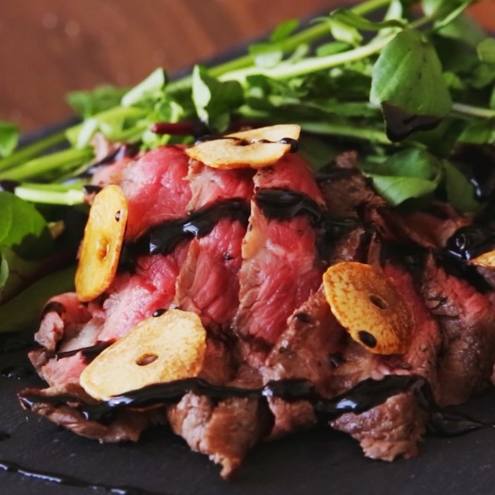4. ベビーリーフ・クレソンとカットしたステーキ、ニンニクを盛り付け、バルサミコソースと