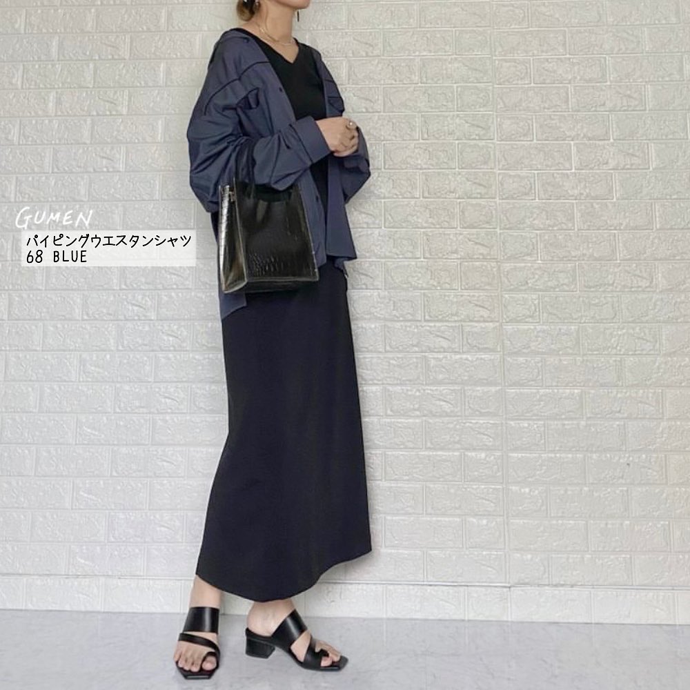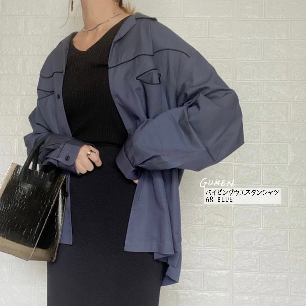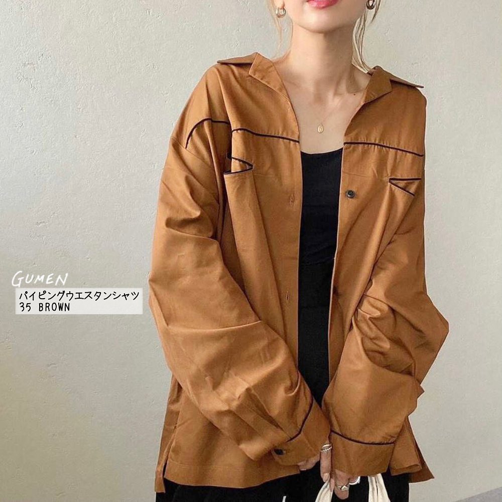 カッコよく過ごしたい😘秋のはじめは、メンズアイテムをゆるっと着こなすのが良き✨パイピング仕様の本格的なディテールを取り入れた、トレンドのウエスタンシャツ👌